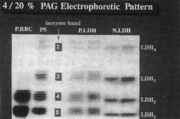 スライドは、4〜20%ポリアクリルアミドグラジェントゲルを用いLDHアイソザイム分析を行った結果です。