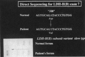 ![]() | スライドはこの症例における遺伝子解析結果であります。これは浜松医大の前川先生グループと共同研究によるもので、詳細は11月の電気泳動学会総会で発表予定であります。 この例では、エクソン7の1本鎖DNAの泳動パターンに異常が見られ、塩基配列決定を試みたところ、コドン320のトリプレットがGATからGTTと、AからTへのtransversion見出されました。この点変異によりアスパラギン酸がバリンに置換され、陰性荷電が一つ消失し、表面荷電がプラスに変異したサブユニットが合成され、結果的に slow type のHサブユニット variant の表現型をとったものと考えられます。 |