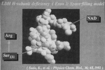 は慈恵医大の須藤先生らによって行われました。この例では、エクソン3のコドン131にAからCへの one point mutation が見出され、131番目のアミノ酸はSerからArgへ変化している事が確認されました。このSerはスライドに示した如く、2次構造の中のαヘリックスからβシート構造に転換する場所に位置し、補酵素NADとの結合部位の近くにあり、NADとの結合に異常をきたしている可能性が強く示唆された例であります。